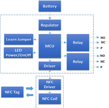 The reader board is placed near to the Ignition key switch and NFC tag will be one of the items tagging along with the vehicle key in the Key chain. When the user inserts the ignition key in the vehicle and turns on the ignition, the board gets powered. The NFC tag being part of the Ignition Key Keychain, gets authenticated by reader and relay is energized which in turn routes the battery power to the other parts of the vehicle. In the absesnce of or in-appropriate /un-paired tag the authentication fails and the relay is not energized and the vehicle doesn't start.