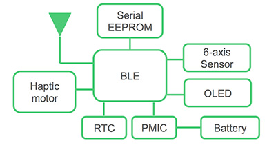 Made possible due to Avnet’s technological expertise, the BLE Wristband Reference solution comes integrated with a plethora of functions such as power management, a real-time-clock, battery charging, OLED display, haptic rotor, sensor hub with MEMs and storage capacity, in addition to the robust communication channels setup with the smartphone host.