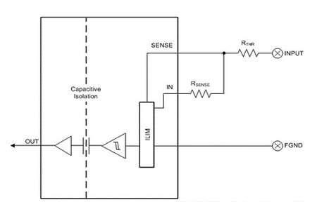 The ISO1211 device receives 24-V to 60-V digital input signals and provides isolated digital outputs. An external resistor, RSENSE, connected between the INx and SENSEx pins, sets the limit for the current drawn from the field input. Internal voltage comparators connected to the SENSEx pins determine the input-voltage transition thresholds.