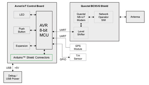 The Starter Kit offers a two board solution. One is the microcontroller based carrier board and the other is the pluggable, cellular connectivity module. Acting as the main host processor, the Avnet IoT Control board features an ArduinoTM compatible R3 expansion slot. It also comes with an ATmega2560 microcontroller, based on an 8-bit AVR RISC-based MCU running at 16 MIPS, as well as a 256KB Flash memory, 8 KB RAM, USB Port, 4 UART, 5 SPI, and 1 I2C.
