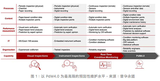图 1 提供了从计划维护向 PdM4.0 转型的路径。显然,随着向 PdM4.0 的转型不断深入,复杂性也随之增加。