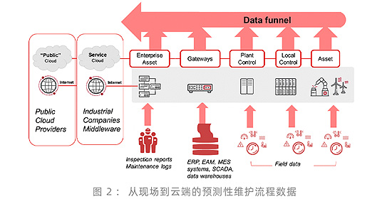 图2所示的是通向云的数据漏斗以及有助于形成预测性维护的不同数据源。