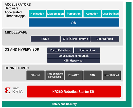 Kria™ KR260 機器人入門套件是繼 KV260 視覺AI 套件和量產型 K26 SOM 之後,KRIA 產品系列的又一全新產品。它能夠在模組化平台(可面向未來擴展)上實現時延更低的確定性多軸控制,且內置功能安全與信息安全功能,專為機器人以及工業自動化的開發人員打造以其熟悉的 ROS 2 為中心的開發體驗,針對工廠、農場、醫院和倉庫等應用場景下的視覺、通信和控制等方面提供硬體加速的優勢。與此同時,自適應 SOM 的優勢並不局限於硬體。